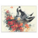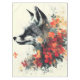 Mystical black and white fox portrait surrounded by vibrant and colourful flowers.