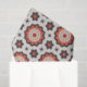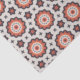 The pattern features a vibrant and intricate design with a bohemian or mandala-like feel. It consists of large, detailed floral and star-shaped motifs in shades of coral, orange, and black against a beige background. Each motif is symmetrical and has multiple layers, giving the pattern a dynamic and textured appearance. Smaller star-like shapes are scattered in between the larger motifs, creating a balanced and visually engaging design.