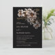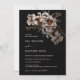 This dark moody wedding invitation features neutral colors and off white flowers and greenery on a black background.