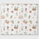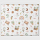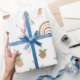 Warm boho-inspired wrapping paper featuring a cozy blend of rattan furniture, leafy plants, rainbows, and soft earthy tones.