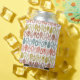 This can cooler has a Boho design of pointy ovals in Boho shades pf pink, blue, gold, and brown.