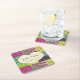 A cream coloured heart shape graphic with faux stitched border is set against a floral patchwork quilt background on this paper coaster that has a warm, colourful look and is perfect for boho style weddings. The heart shape is ready to be personalised with the names of the bride and groom and their wedding date.