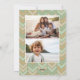 A modern Merry Christmas photo card in shades of pastel gold and green. Curvy retro lines surround the photo in shades of pastel. The front photo is a mod arch with a white border. The back includes 2 more photos. The background for the back is a boho coloured herringbone pattern - an eclectic mix of patterns.