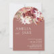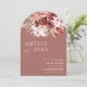 Elegant arch-shaped photo wedding invitation featuring burgundy and blush watercolor florals on a warm dusty rosewood backdrop — perfect for boho modern weddings.