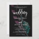 Romantic boho chic wedding invitation features colourful feathers and a black background.