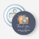Wedding favour bottle openers with a watercolor illustration of an orange camera and a floral bouquet resting on top. The flowers in the bouquet are light pink and orange with green leaves, a pretty floral arrangement.
