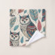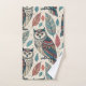 This bathroom towel set features a boho pattern of teal, rust and grey owl illustrations outlined in black and surrounded by autumn leaves in coordinating colours on a beige background.