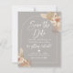 Save The Date engagement card in beautiful tones of grey, beige, and white with an arch design and pampas grass foliage.