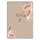 Beautiful dried flowers, pampas grass, palm fronds, wheat, dried leaves and berries table number card.
