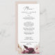 This boho pampas grass wedding dinner menu card is perfect for a summer wedding. The floral watercolor design features bohemian burgundy and blush pink flowers with sprigs of neutral pampas grass and golden dried palm leaves. This menu can be used for a wedding reception, rehearsal dinner, or any event.