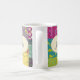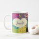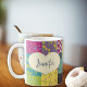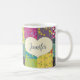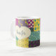 This pretty mug is ready to be personalised with a name in script or cursive writing and features a cream coloured heart shape graphic set against an illustration in the style of a colourful boho patchwork quilt. The heart and name appear on both sides of this mug.