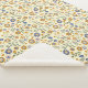 This image is a seamless pattern featuring a vibrant boho floral design. The pattern is composed of various stylised flowers in shades of blue, yellow, and orange, interspersed with leaves and small dots. The background is a simple white, allowing the colourful flowers to stand out. The overall aesthetic is cheerful and playful. The intricate details of the floral elements create a sense of depth and texture, adding visual interest. The use of contrasting colours adds vibrancy and makes the pattern visually appealing.