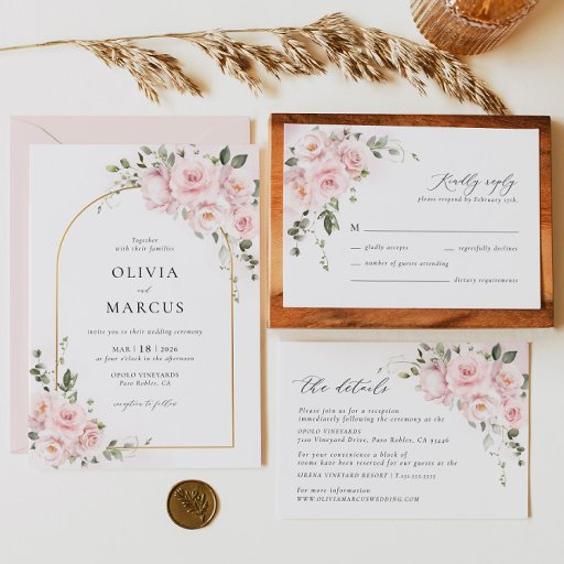 Bohemian pink rose bouquet style with faux gold arch table number template with elegant and blush florals and greenery botanicals in hand-printed watercolor.
