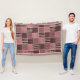 This throw blanket has a Boho design of squares with patterns in each in black and pink.