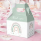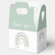 Boho baby shower favour box featuring "thank you" in a stylish white script with swashes and a cute abstract watercolor of a sage green, orange and lavender rainbow with hearts. Personalise with the mother-to-be's name and shower date.