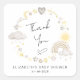 Whimsical gender-neutral boho baby shower thank you sticker featuring "Thank You" in a stylish script and yellow watercolors of a rainbow, sun, hearts, stars, moons and clouds. Personalise with the name of the mother-to-be and shower date in simple typography.