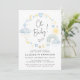 Whimsical boho baby boy shower invitation featuring blue and yellow watercolors of a rainbow, sun, hearts, stars, moons and clouds, "Oh Baby!" in a stylish script and the mother-to-be's name and shower details in simple modern typography.