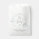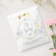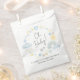 Whimsical boy baby shower favour bag featuring pastel blue and yellow watercolors of a rainbow, sun, hearts, stars, moons and clouds and "Oh Baby!" in a stylish calligraphy script. Personalise the mother-to-be's name and the shower date in simple modern typography.