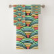 This towel set has a boho design of overlapping rainbows in boho colors of blue, green, yellow, and red.
