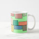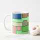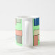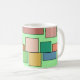 This mug has a boho modern design of rectangles attached to horizontal lines in various sizes and boho colours.