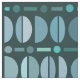 A vintage style mid century modern pattern with geometric bowls shapes, dots and lines. Shades of dark blue and green.