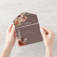 This design features a rust, peach, white and cream watercolor floral bouquet frame on a soft cocoa background. Personalised All-In-One invitations are a unique combination of both a beautifully printed custom invitation with an easy to tear off perforated RSVP postcard. And they are so easy to use! You simply fold, then seal the back flap with the three included clear stickers, and mail. And when your guests receive your custom invite, they just tear the perforated RSVP Card off and drop it back in the mail to you!