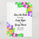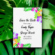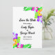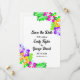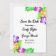 This elegant tropical wedding save the date invitation is perfect for a modern summer wedding. The simple design features bloom yellow, purple, and pink flowers with elegant black typography on a white background.