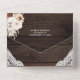 Boho rustic wedding invitation features neutral flowers and string lights on a wood background.
