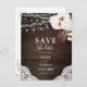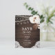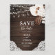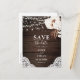 Boho chic wedding save the date postcard features neutral flowers with dried palm leaves and string lights on wood decorated.