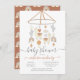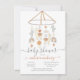 Modern and cute Boho Baby Shower invitations. Great Scandinavian feel with llamas, rainbows, cactus, pompoms, clouds and stars all hanging on a mobile. Neutral colour scheme for a boy or girl baby to be. Terra cotta, dusty blue grey and white.