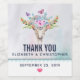 A personalised wedding wine bottle label with a turquoise and pastel watercolor background. A boho chic animal skull with a floral bouquet upon its head and little butterflies fluttering about. A cute decorative border with little teardrop shapes in light blue.