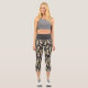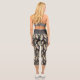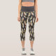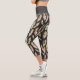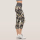 Boho style feathers in coral pink, light blue and gold float on a dark background on this pair of chic capri leggings. Small gold confetti flecks add extra interest to the pattern.