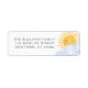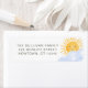 This sun-themed baby shower return address label features a cute yellow smiling sun, a blue cloud, and stylish typography.