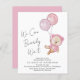 Boho budget-friendly baby girl shower invitation featuring a cute watercolor illustration of a pink teddy bear floating with balloons, and "We Can Bearly Wait" in a handwritten calligraphy script.