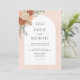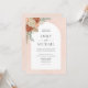 Announce your romantic boho style wedding with this modern invitation. A delicate blush pink border frames a watercolor arrangement of terracotta hydrangeas, peach peonies, ivory ranunculus, dried pampas grass, and sage green eucalyptus foliage. This earthy botanical design is perfect for couples planning a late summer or fall bohemian wedding.