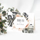 With modern boho style, this stylish tropical Thank You card has flowing Monstera leaf foliage with soft peach and white floral elements including orchids and sweetheart roses in off-white and terracotta peach. A trendy geometric triple frame in shimmering gold surrounds the text on the front of the card. Personalise this card with your name(s). The inside of the card has a sample thank you message that can be personalised with your own desired wording. You can also delete the sample inside text entirely if you wish to handwrite your thank you cards.