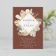 Modern tropical wedding invitations featuring your names inside of a diamond-shaped gold foil frame with a brown background. Tropical flowers and foliage surround the frame in earthy shades of cream, tan, beige, rust, brown and sage green. The tropical boho wedding invitations reverse to a light sage green watercolor background.
