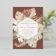 Modern tropical wedding invitations featuring your names inside of a gold foil geometric frame with a brown background. Tropical flowers and foliage surround the frame in earthy shades of cream, tan, beige, rust, brown, and sage green. The tropical boho wedding invitations reverse to a light sage green watercolor background.