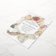 Modern tropical wedding invitations featuring your names inside of a gold foil geometric frame with a white background. Tropical flowers and foliage surround the frame in earthy shades of cream, tan, beige, rust, brown, and sage green. The tropical boho wedding invitations reverse to a light sage green watercolor background.