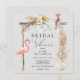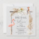 Gorgeous bridal shower invitation features boho wedding arch with pink flamingo and exotic bird on watch and adorned with tropical flowers, protea, and pampas.