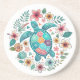 Boho Turquoise Floral Sea Turtle - Coastal Round Coaster