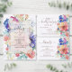 Positioned in the centre of each side of the fan is an elegant, clear frame that serves as a refined window to the wedding program details. The transparent frame delicately floats above the vibrant flowers, allowing the beauty of the blooms to shine through.