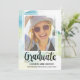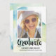 This chic photo graduation announcement features the word "Graduate" written in beautiful calligraphy, a subtle blue and green watercolor background, and a framed photo of the new graduate. Grad party details can be added to the back of the card.