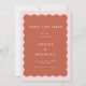 A modern and stylish wedding save the date announcement featuring a wavy scallop shape in terracotta with a blush pink edge with white font. Add your wedding website and QR code on the reverse.