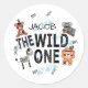 Cute boho wild one first birthday stickers. Design featuring of wild safari animals dressed with boho elements and ''wild one'' script with colourful lines and ethnic writing. Personalise with child's name. Perfect as a thank you favour or envelope seal.