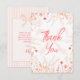 Boho Wildflower Baby in Bloom GIrl Baby Shower Thank You Card. An elegant thank you note featuring a delicate watercolor meadow of wildflowers in soft pink and peach hues. The airy design and modern script typography create a whimsical, garden-inspired aesthetic perfect for a spring or summer baby shower. Personalise with your informtaion and your own sweet saying. Delete any text for a blank card back to handwrite your thank you. Matches the Boho Wildflower Baby in Bloom Girl Baby Shower invitation in the collection at Cross Fox Design.
