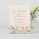 This rustic boho design features a watercolor border of orange and blue wildflowers along the bottom. The words "Save the Date" and the couple's names appear in stylish charcoal grey handwriting script, with the remaining text in sans serif font on a blush pink background.