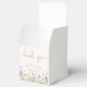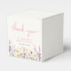 Elegant light cream favor boxes for your baby girl shower featuring "thank you" and "a little wildflower is on her way" showcased in grey typography and a stylish pink script, and boho-inspired whimsical watercolors of dainty purple, pink and yellow wildflowers. Add the name of the mother-to-be in simple pink typography.