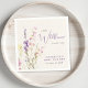 Elegant light cream baby girl shower napkins featuring "a little wildflower is on her way" showcased in a blend of modern grey typography and a whimsical purple script, and a boho-inspired watercolor bouquet of purple, pink and yellow wildflowers.