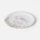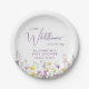 Elegant baby girl shower paper plates with "a little wildflower is on her way" written in grey typography and a stylish purple script, and boho-inspired whimsical watercolors of dainty purple, pink and yellow wildflowers. Add the name of the mother-to-be in simple purple lettering.
